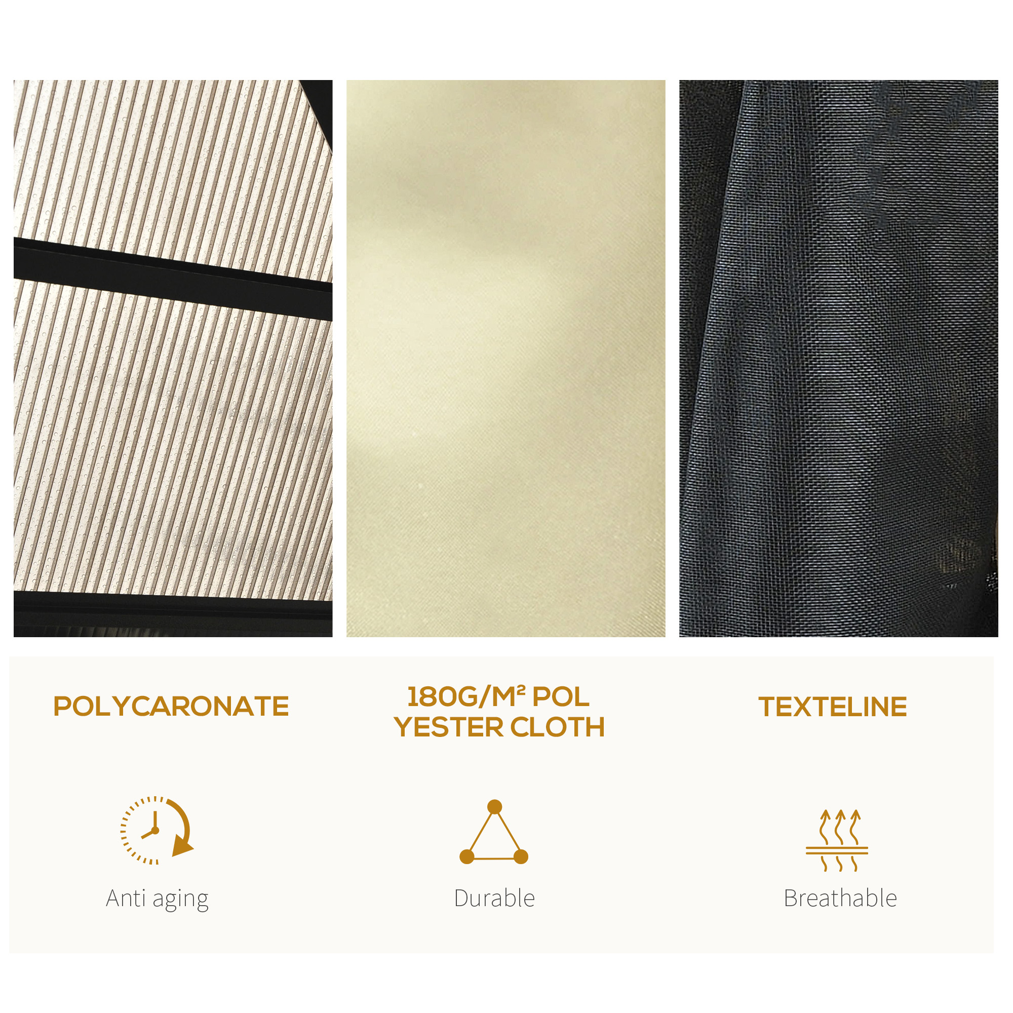 Create the perfect spot to hold your outdoor gatherings with this impressive deluxe gazebo from Outsunny. Crafted from polycarbonate into an angled design in a sleek finish, the hardtop roof, protecting you from water and UV whilst located inside. It€™s finished with four large curtains, each with a mesh screen, providing privacy when required and keeping out bugs and insects at the same time. A grand way to impress your guests every time. Eight ground stakes included for extra security.