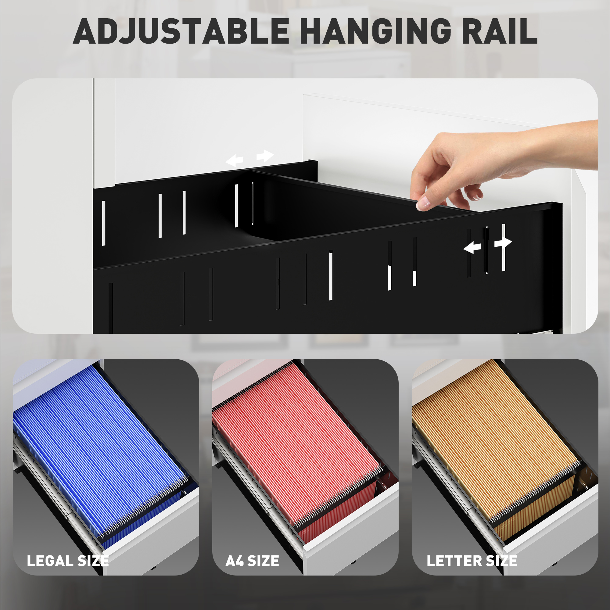 - Adjustable rail in large drawer for A4, legal and letter-sized files