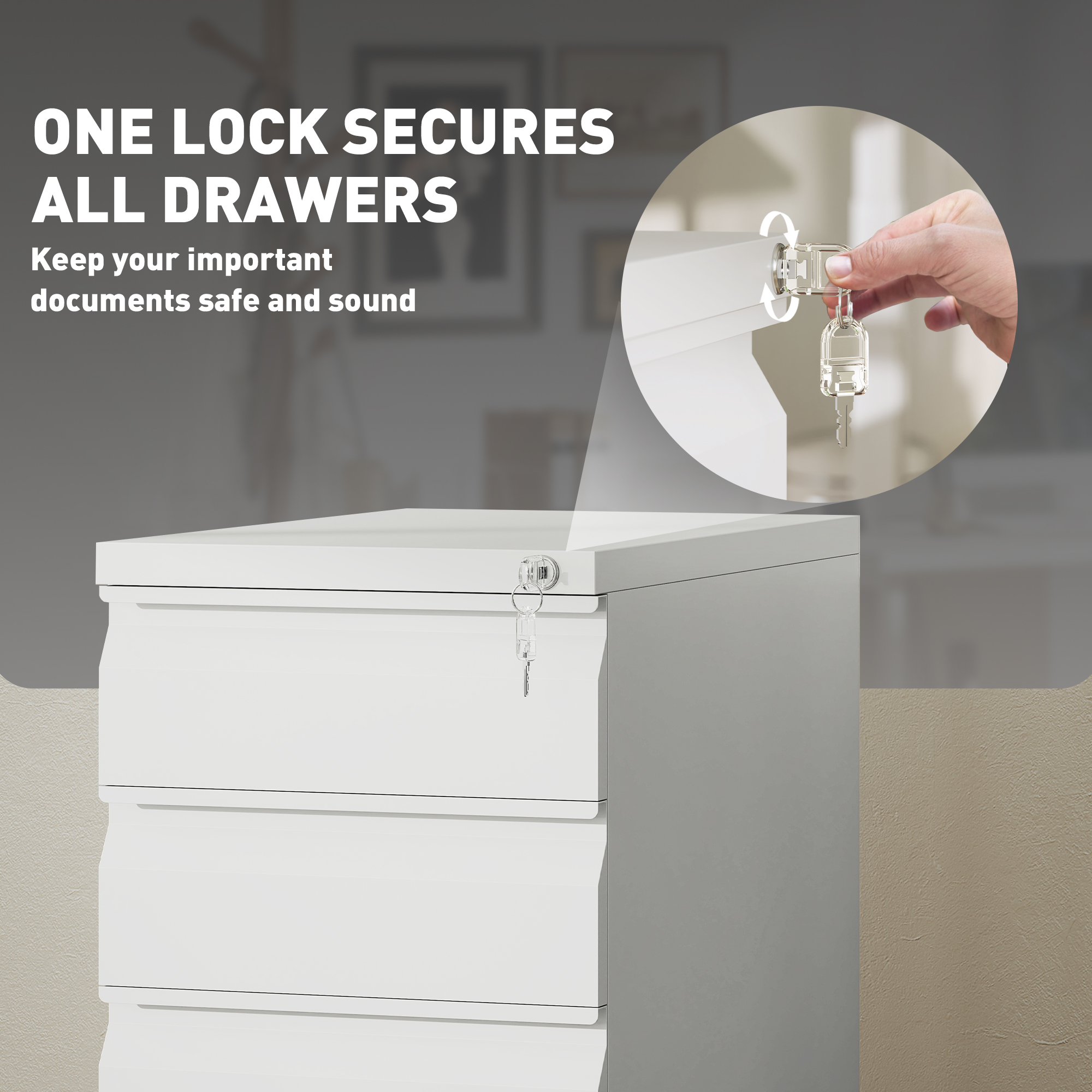 - Top lock secures all drawers for document safety, with two keys for easy access