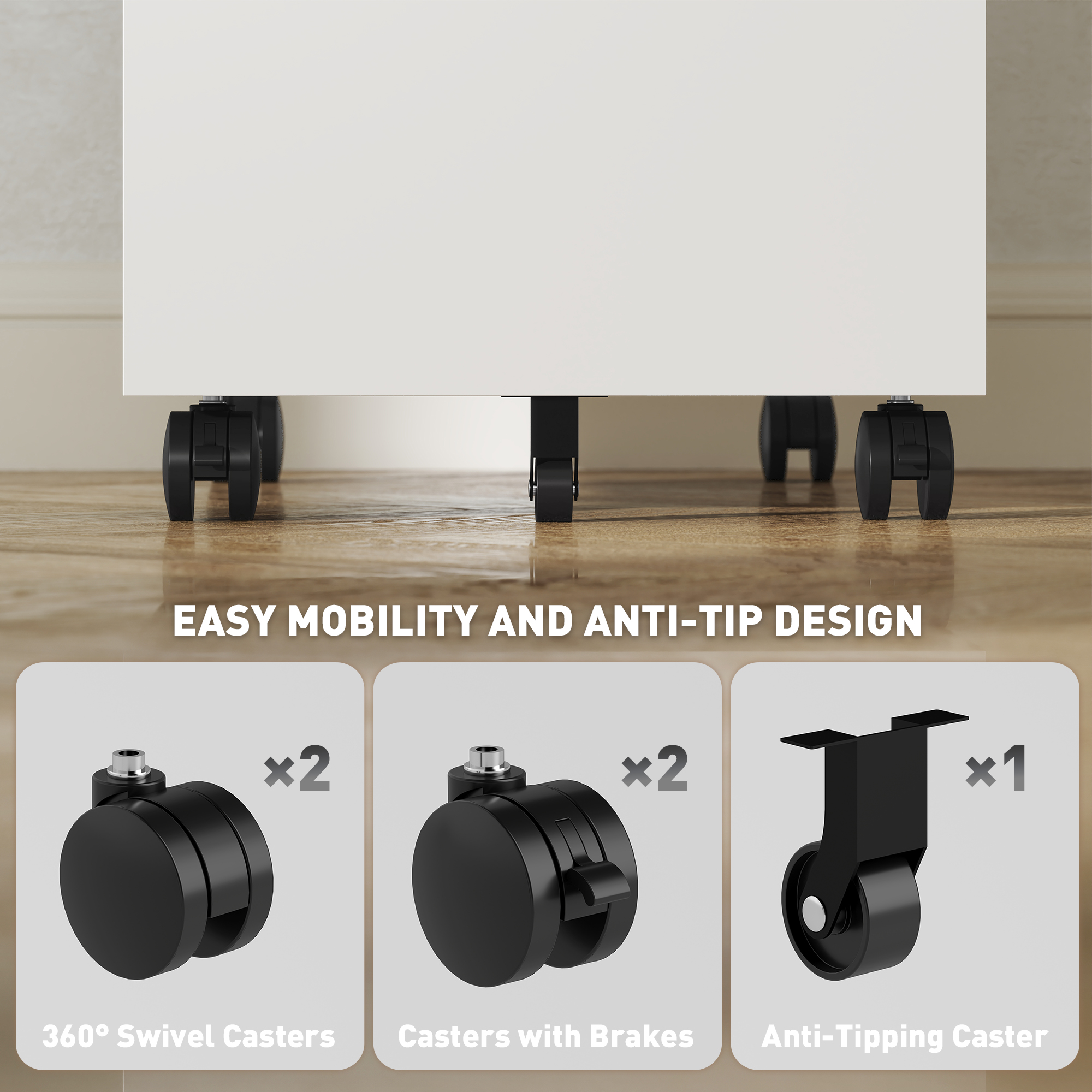 - Four swivel casters, two with brakes, for mobility and stability