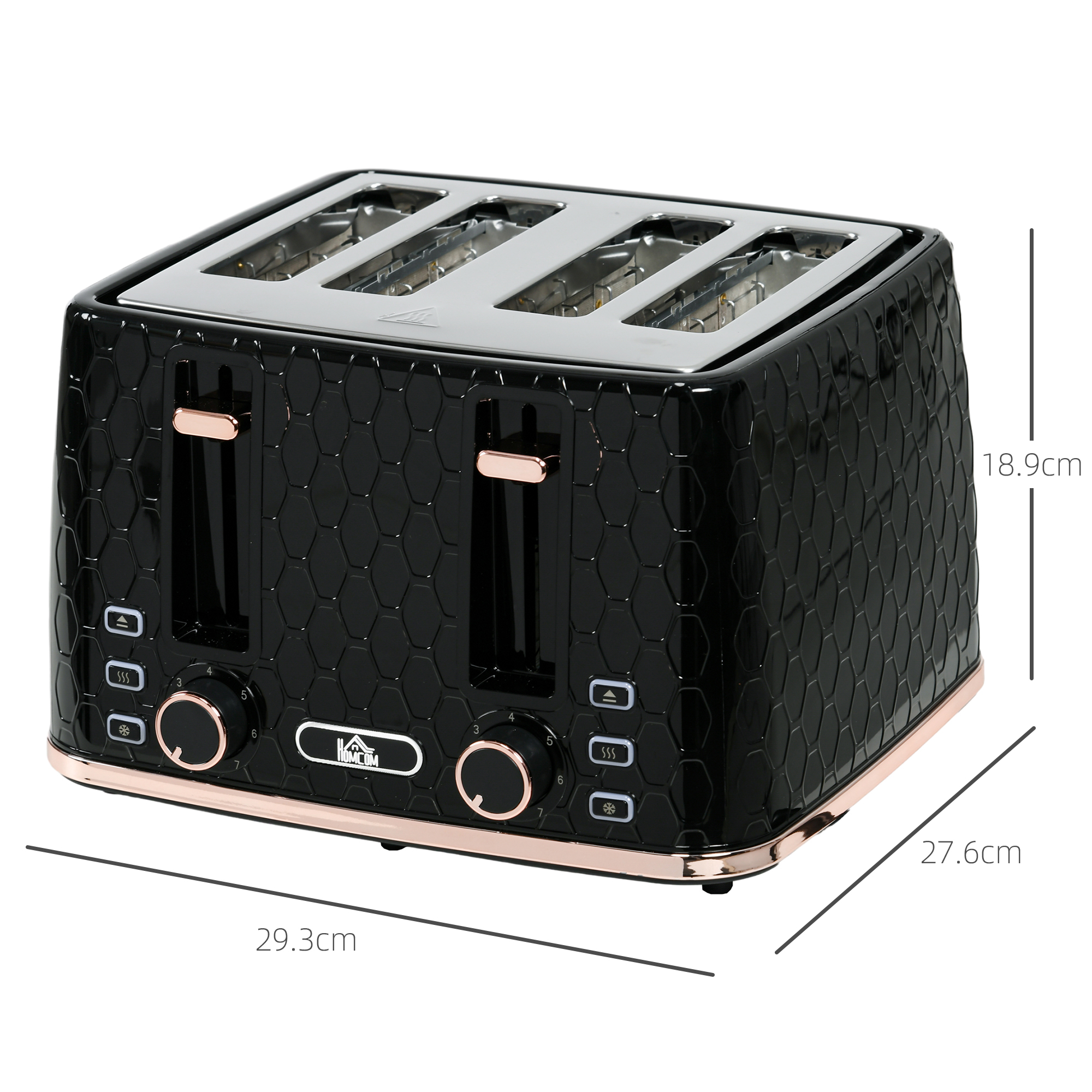 Wake up to delicious toast, in modern style - thanks to this HOMCOM four slice toaster. It comes in a honeycomb textured design - this is a piece you'll love having as part of your countertop. Seven toasting levels means you can have your toast as brown and crispy as you want, with automatic centring for an even result every time. The automatic shut-off means no stuck, and burnt toast, complete with a removable comb tray for easy cleaning.