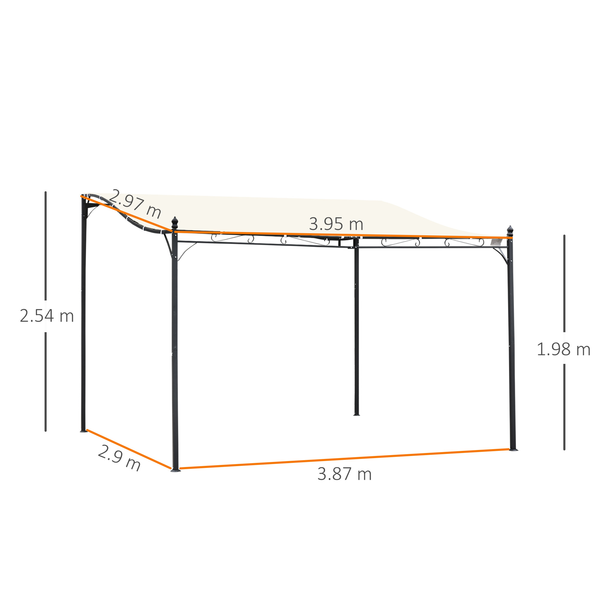 Give yourself a spot to take shade and shelter outdoors with this lean to pergola from Outsunny. It is crafted into a 297 x 395cm design, consisting of a taller back and short front, with a waved connecting frame covered with a top 180gsm polyester canopy, providing shelter against direct sunlight. With an elegant scroll design on the front, the wall mounted canopy is finished with 16 drainage holes on the top to prevent water accumulation and with eight ground stakes to pin to the ground.