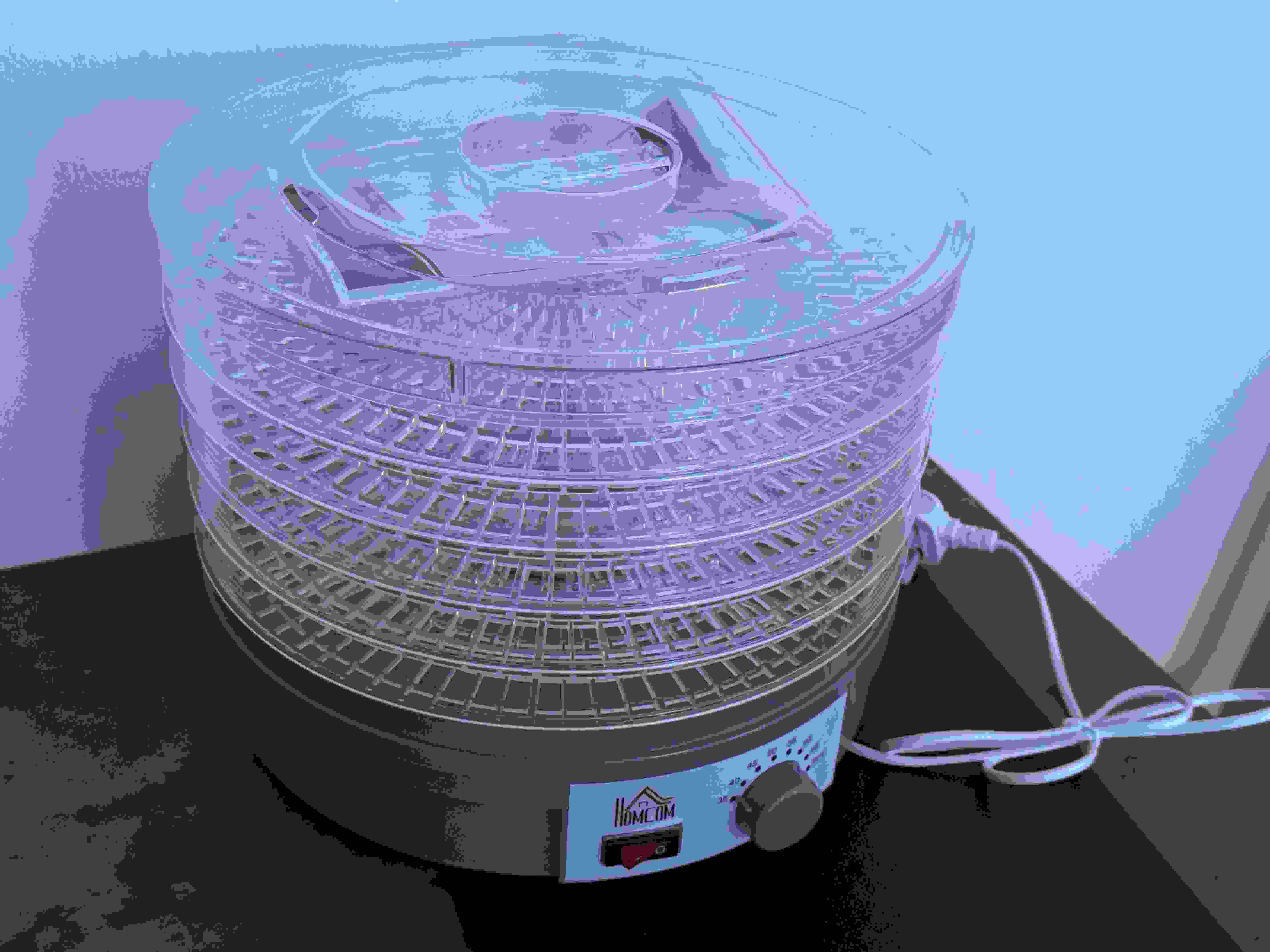 Dehydrate fruit, vegetables and other foods in an easy and hygienic way with this fruit dehydrator from HOMCOM. Adjustable temperature range between 35-70„ƒ means you can set to a safe heat for different ingredients. This dryer machine comes with five stacking trays, holding plenty of different foods - fruits, vegetables, breads, some meats. Even better, it's ready to use straight out the box, so unpack and start making your next idea.
