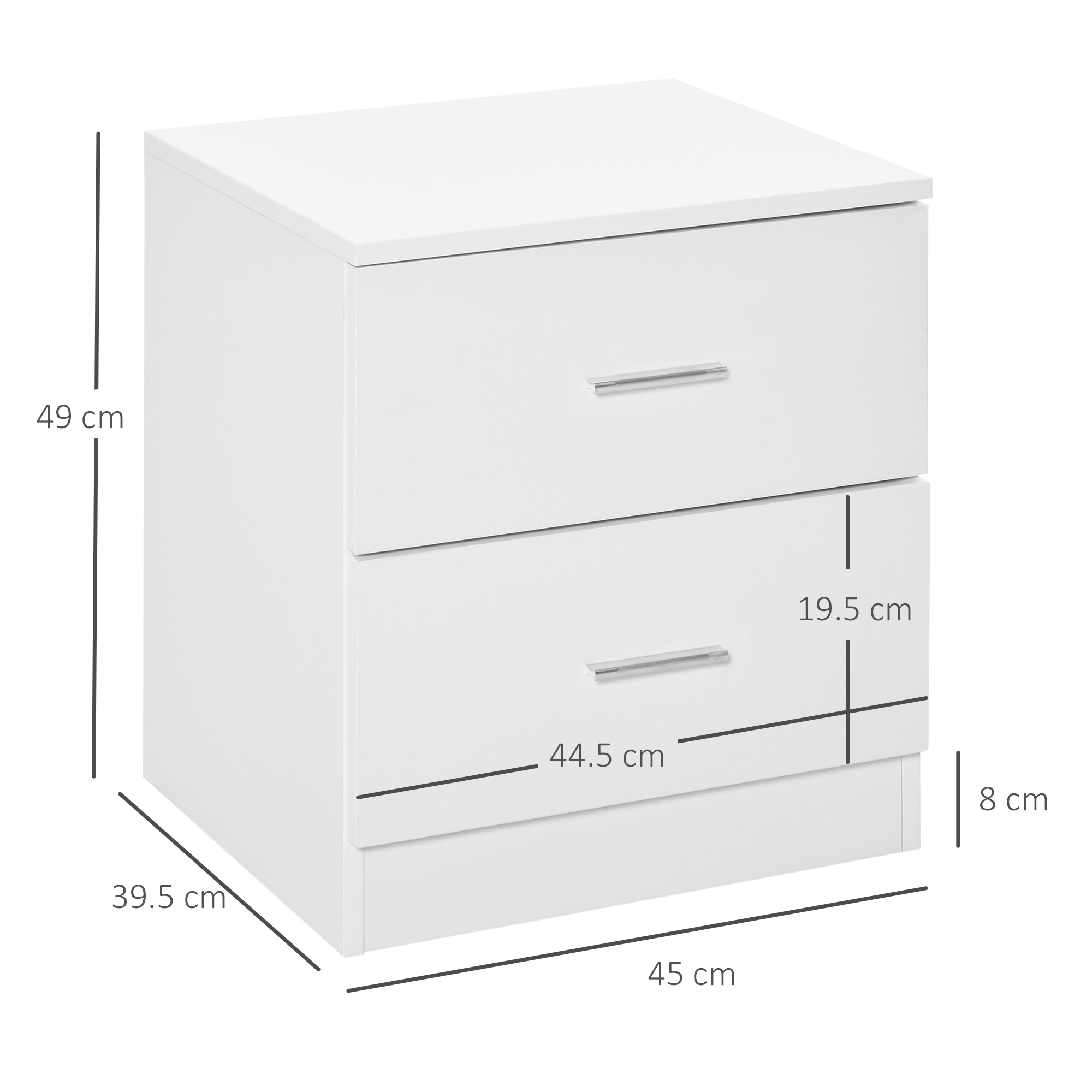 Modern boxy organisation for your bedside - this nightstand from HOMCOM. Comes with two drawers for generous amount of storage. Made from particle board, structure is durable, in a clean white finish for versatility. Smooth finish is easy to clean. It's finished with sleek metal handles to open and close both drawers easily.