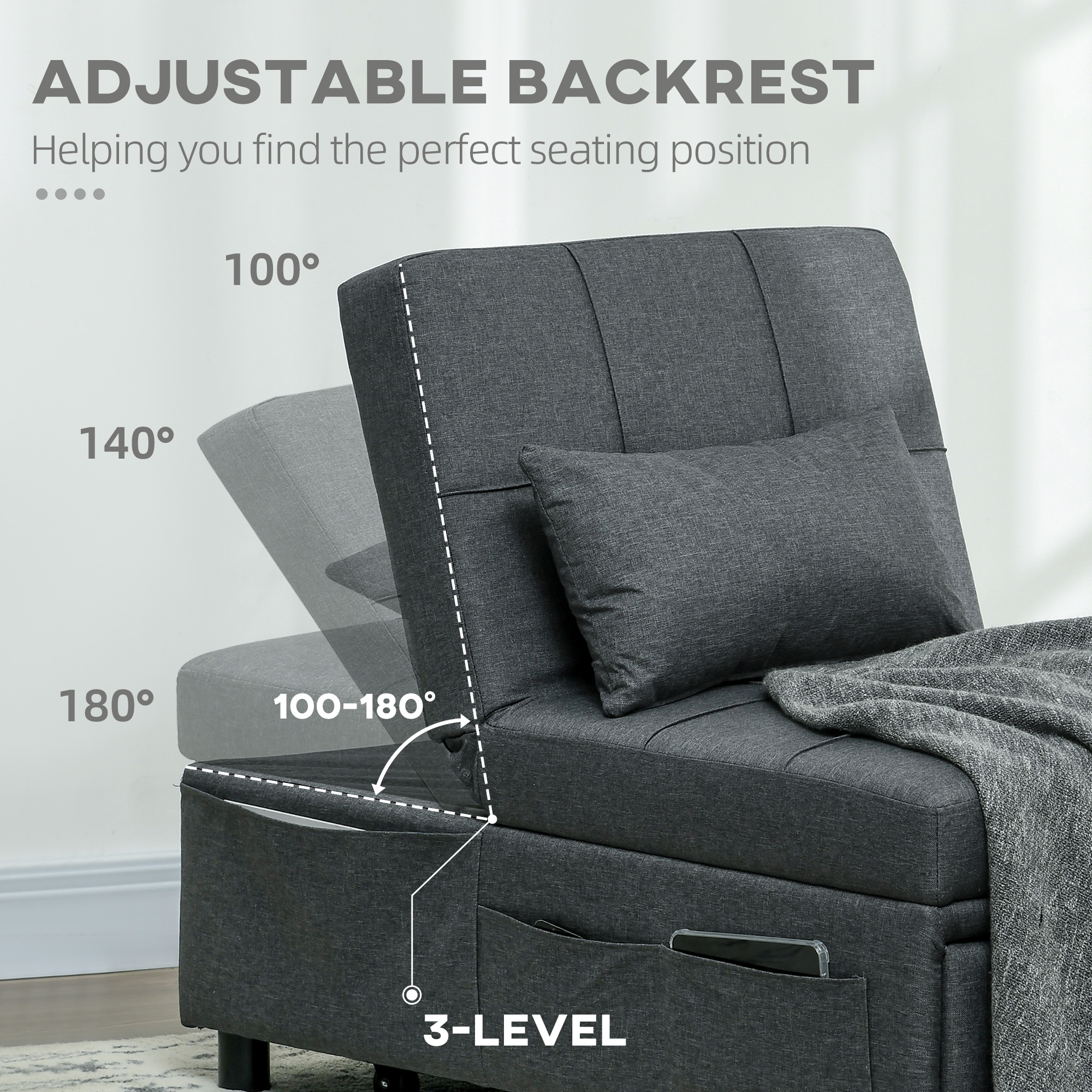 - Adjustable three-position back angles: 100°, 140° and 180°