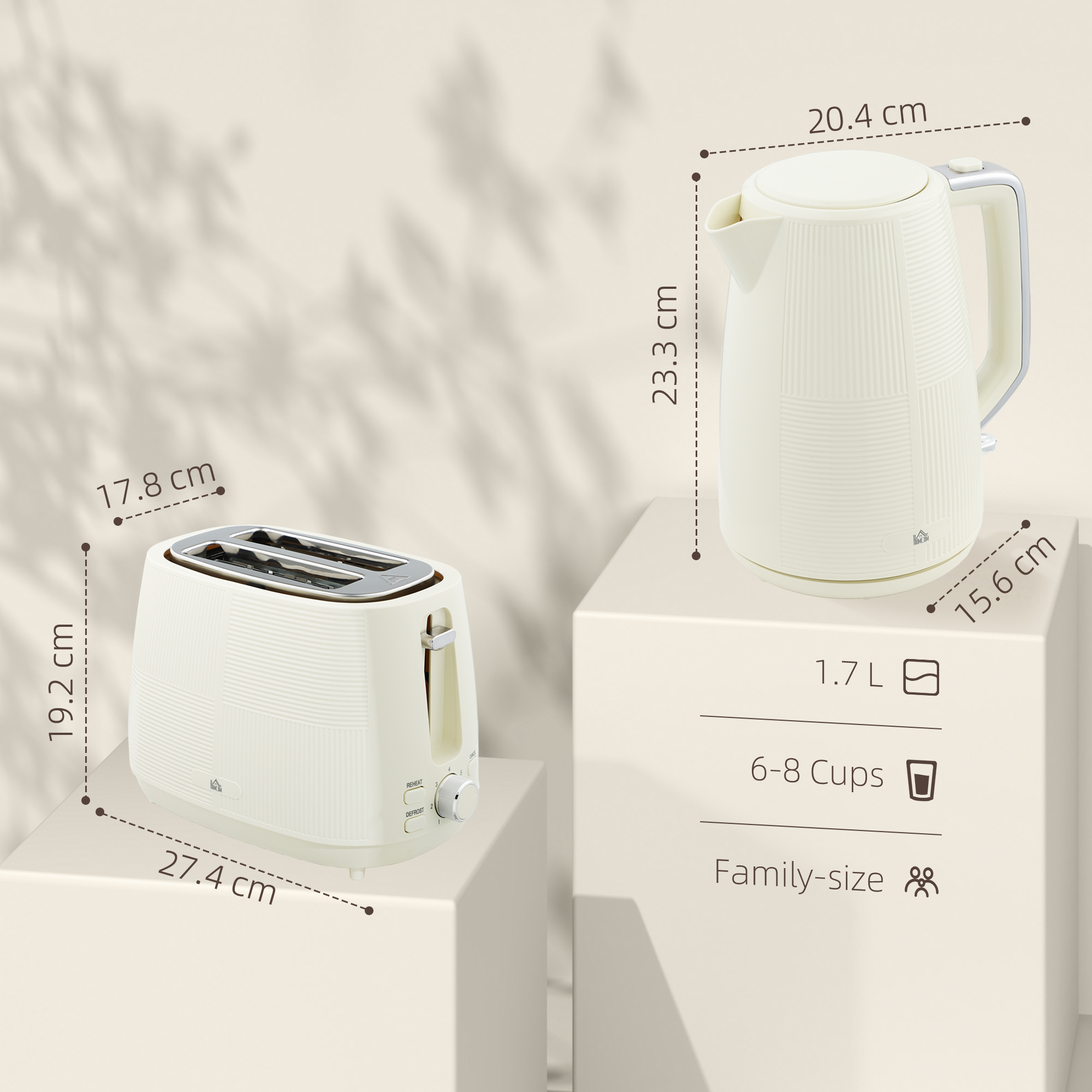 Elevate your morning routine with the HOMCOM Cream Kettle and Toaster Set. This chic, modern duo includes a 3000W electric kettle that boils a cup of water in just 42 seconds and a versatile toaster with reheat, defrost, and seven-level browning control. Both items feature safety auto-shutoff and are designed for easy use and cleaning, ensuring a seamless breakfast experience.