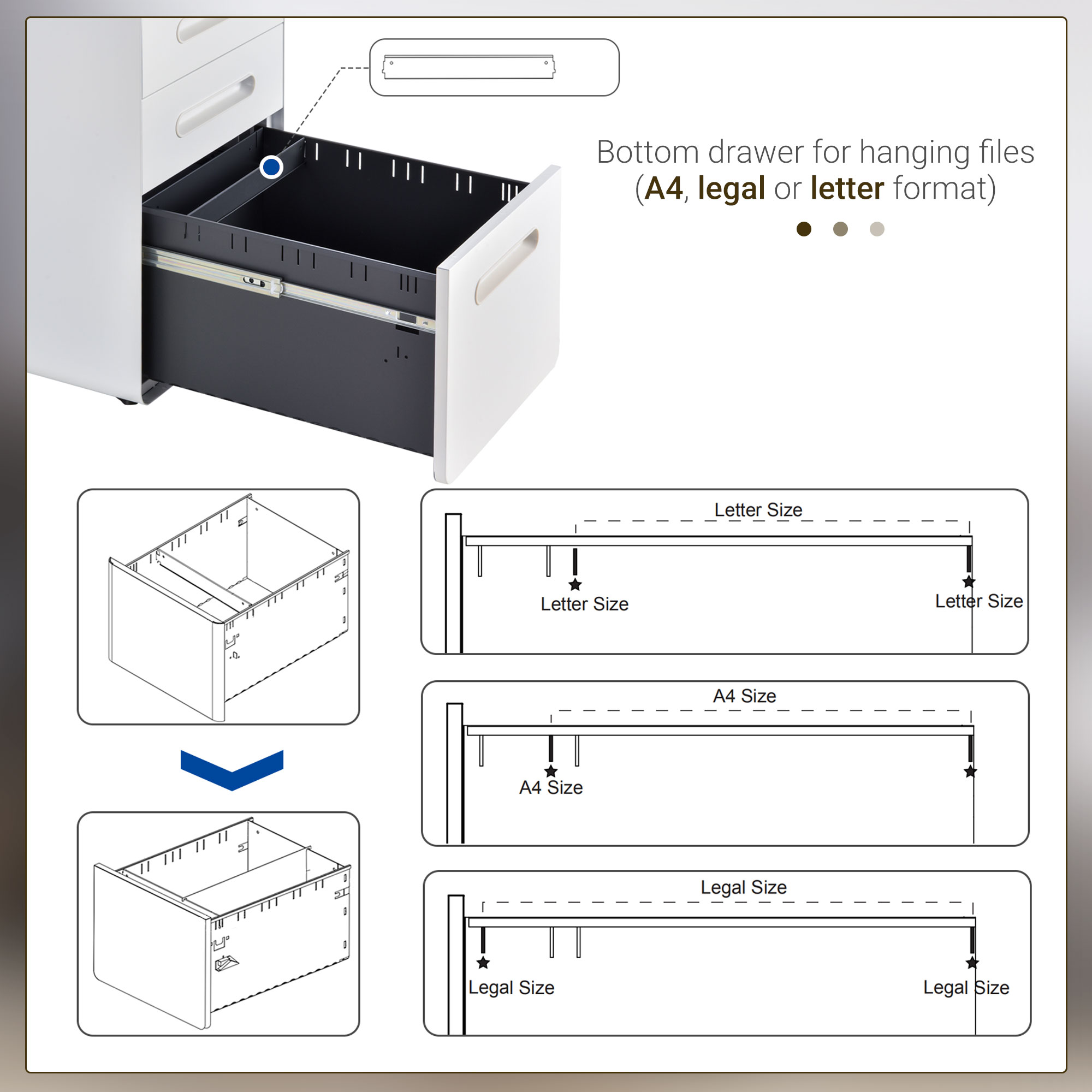 - Two small top drawers and a large bottom drawer. Room for files and folders