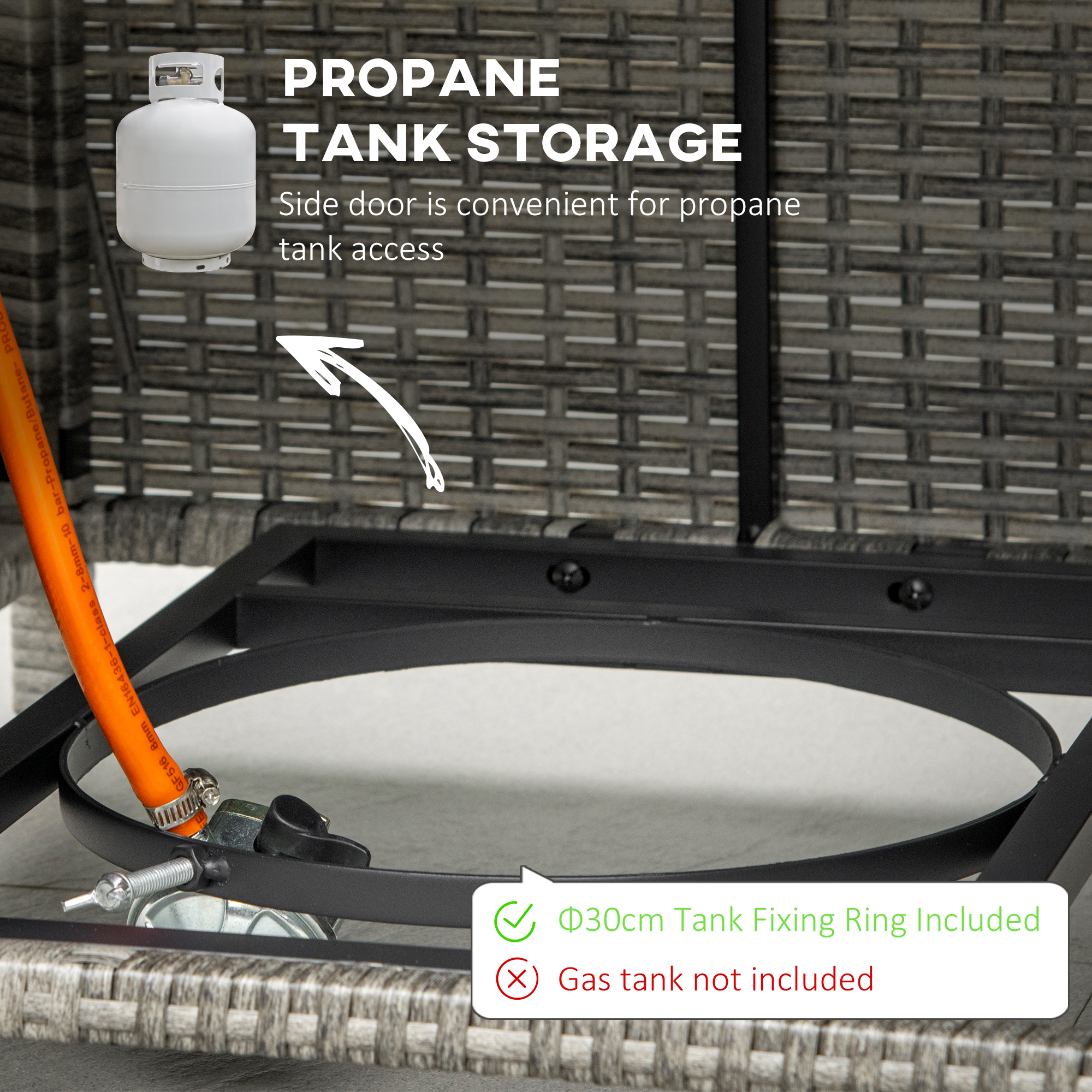 Enjoy garden warmth and ambiance all year-round with this Outsunny fire pit table. Rattan-effect design is stylish, looks great matched with other furniture. The tabletop is fitted with a centre fire pit - the 50,000 BTU burner is powerful and produces a clean smokeless burn. The flame can be adjusted too. The thermocouple closes the valve if the flame goes out for safety - no leaking gas. Complete with a glass guard, protecting against flying sparks.