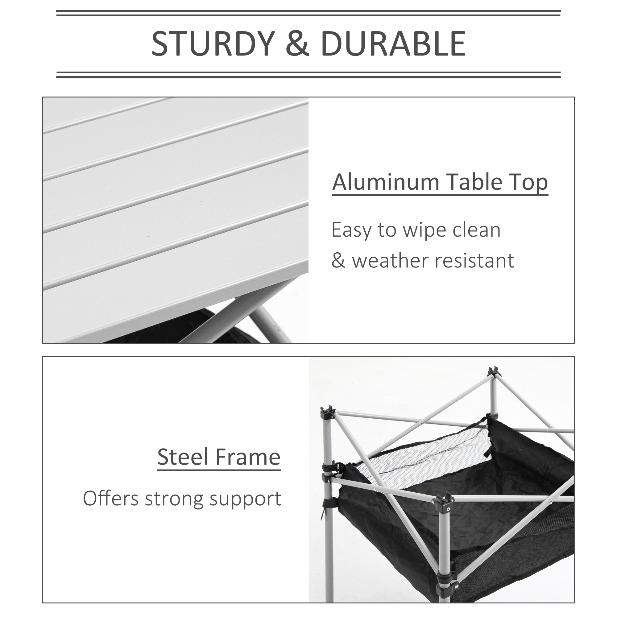 Bring cool innovation into your everyday outdoor life and special trips - choose this steel frame table from Outsunny. The design combines a small square table with a mesh storage bag underneath - meaning you can dine and keep everything you need stored right underneath. The bag can also be used as a temporary bin, preventing rubbish build-up when you're camping. To complete this clever piece, it comes with a detachable aluminium table top which rolls up for compact storage. An essential outdoor dining product which makes your trips even more enjoyable than before.