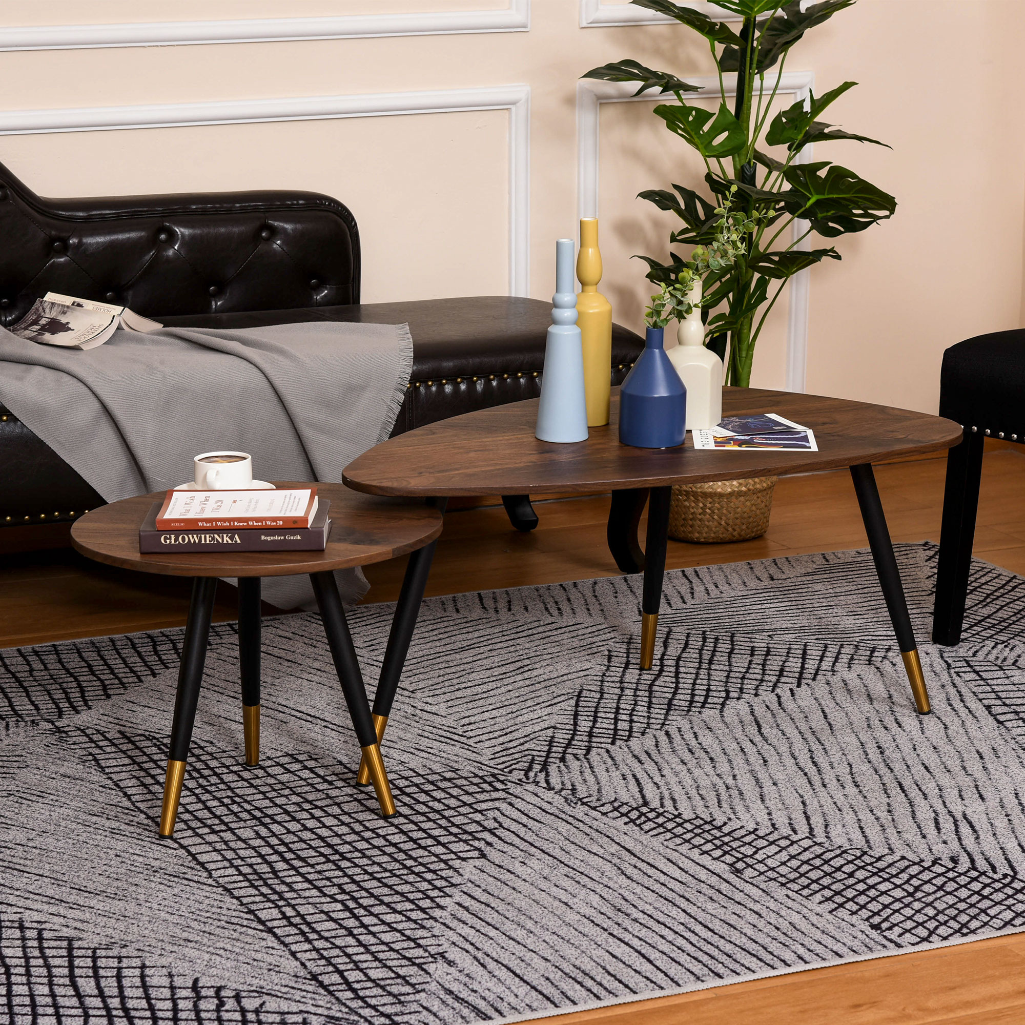Enhance your home style with this HOMCOM coffee table set. Set comes with a small and large table - both can be combined for extended space or left separated. There are three steel legs on each piece, keeping the tables balanced and steady, with wood effect markings for a natural look. The table tops, made from robust MDF, with its walnut colour finish - a modern Scandinavian style set.