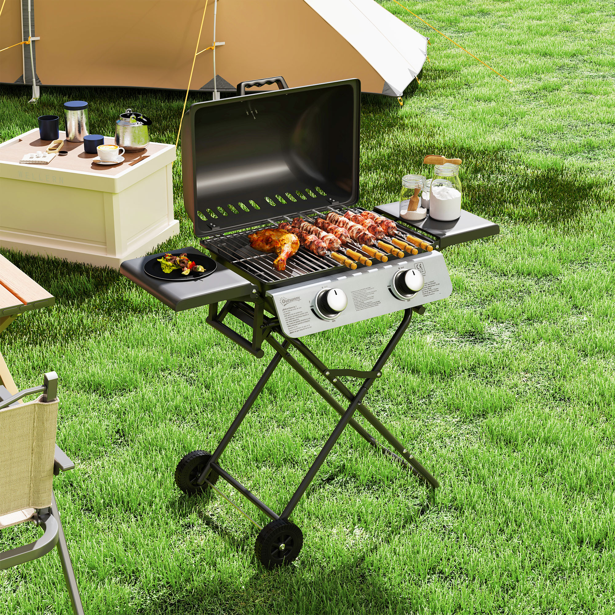 Enjoy delicious BBQ food in cool style, with this Outsunny suitcase-style gas grill. It features two main burners to cook different foods, at different temperatures - cook a complete meal; controlled by easy-use piezo ignition. The two side tables keep BBQ ingredients and seasonings within reach. Complete with an easy-read thermometer on the lid for heat control. When done, just fold the grill and pull the handle; moves smoothly with the two wheels.
