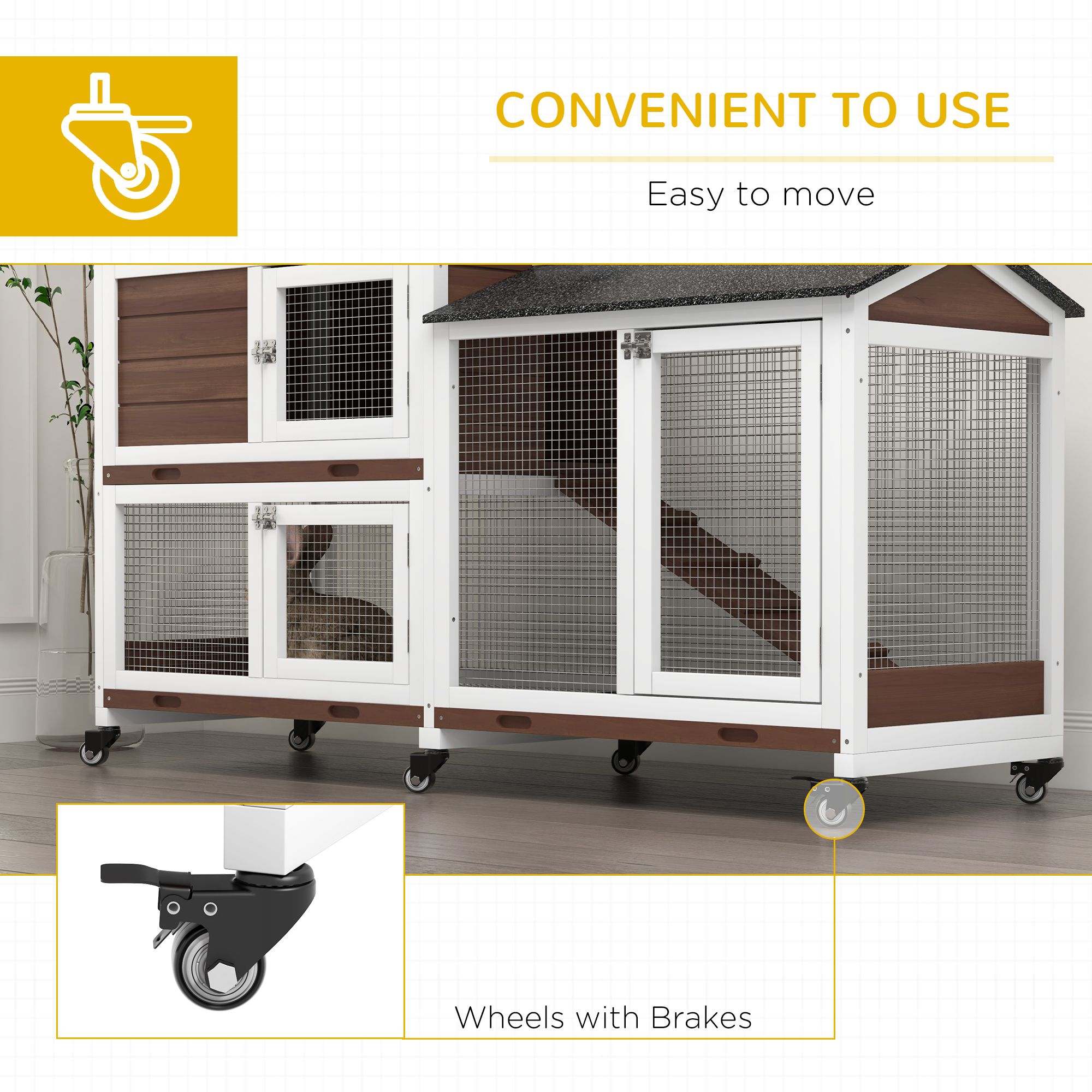 The ideal home for rabbits and other small pets - this spacious rabbit cage from PawHut consists of two floors with a large house and a guinea pig run - they'll roam easily using the ramp. Made from solid fir wood, the indoor guinea pig cage is covered in water-resistant paint for protection against wet weather, whilst the tilted asphalt roof ensures the area is dry. Watch your pets in their new house through the mesh wire, which keeps the area ventilated.